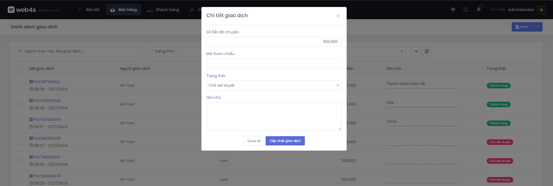 - Click chọn xác nhận giao dịch sẽ show modal cập nhật số tiền, trạng thái, mã tham chiếu và ghi chú thông tin giao dịch