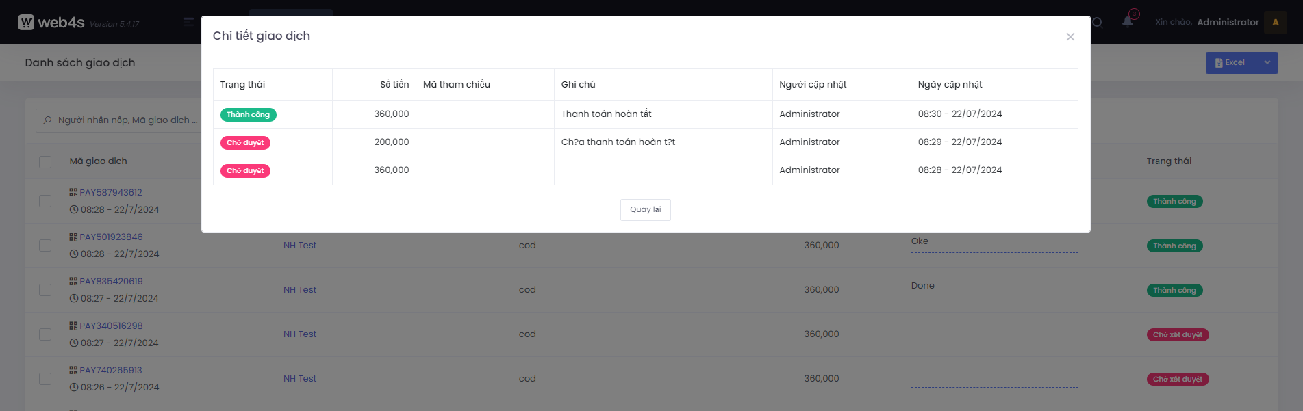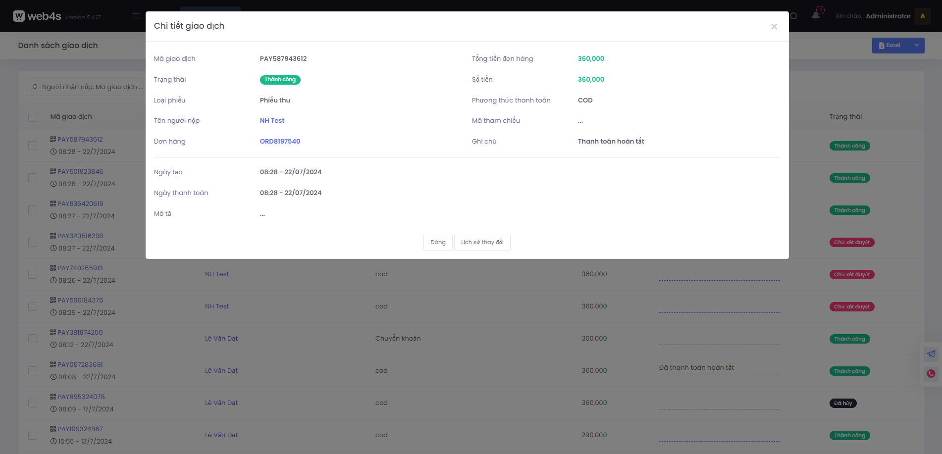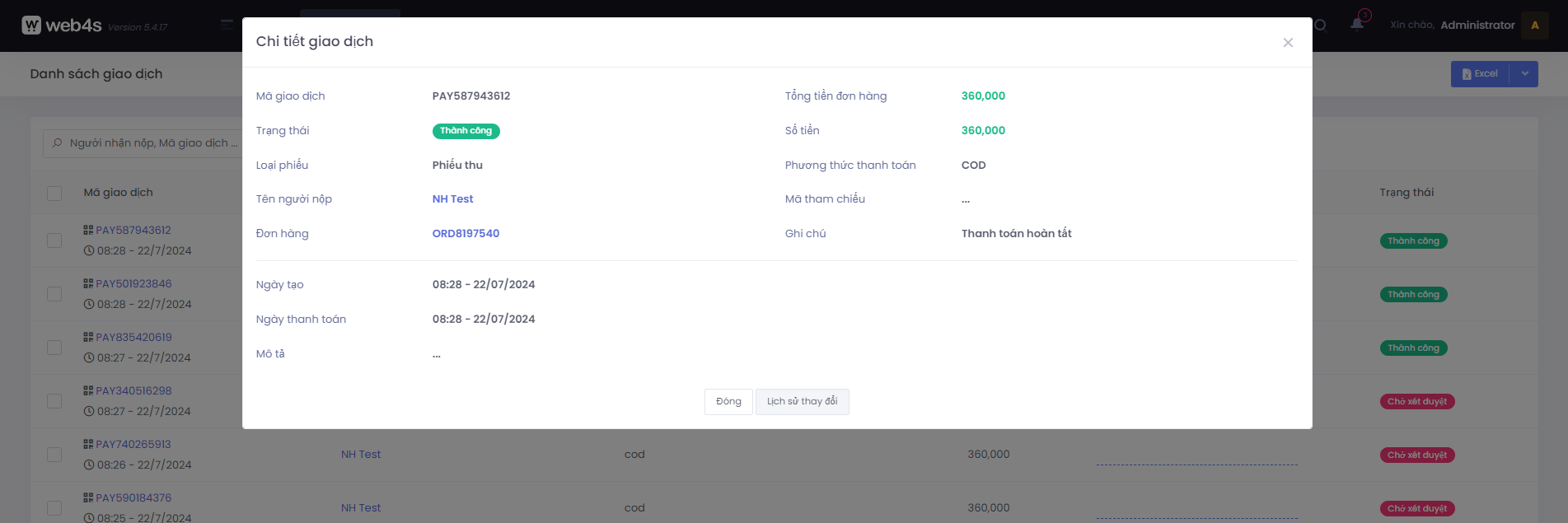 Tại màn hình danh sách giao dịch, click vào mã giao dịch sẽ hiển thị modal thông tin chi tiết giao dịch
