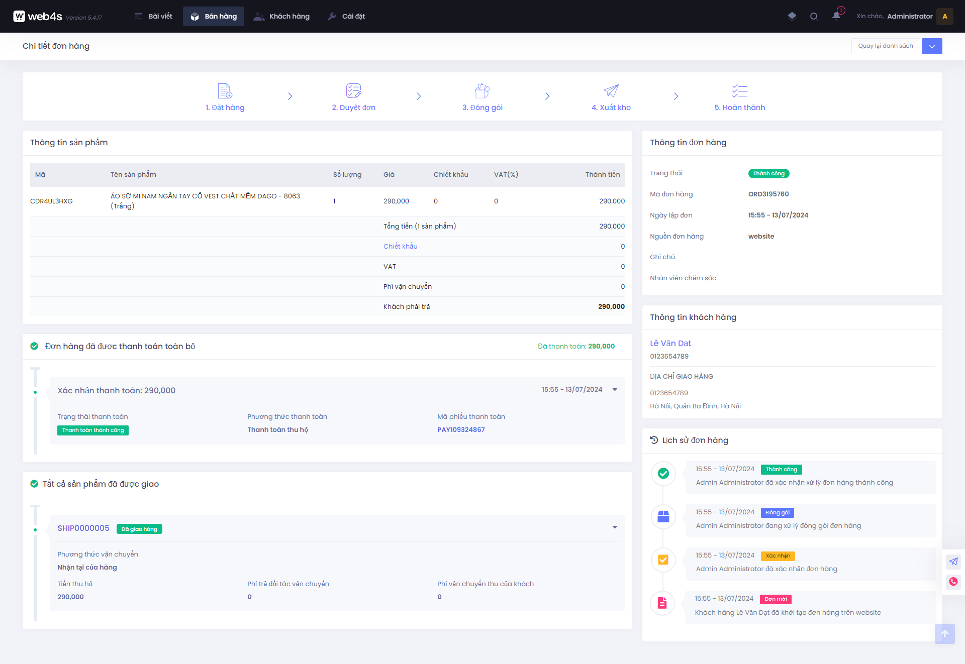 - Cột bên phải là thông tin cơ bản đơn hàng (mã đơn hàng, nguồn đơn hàng, ghi chú, ...), thông tin khách hàng, thông tin lịch sử đơn hàng