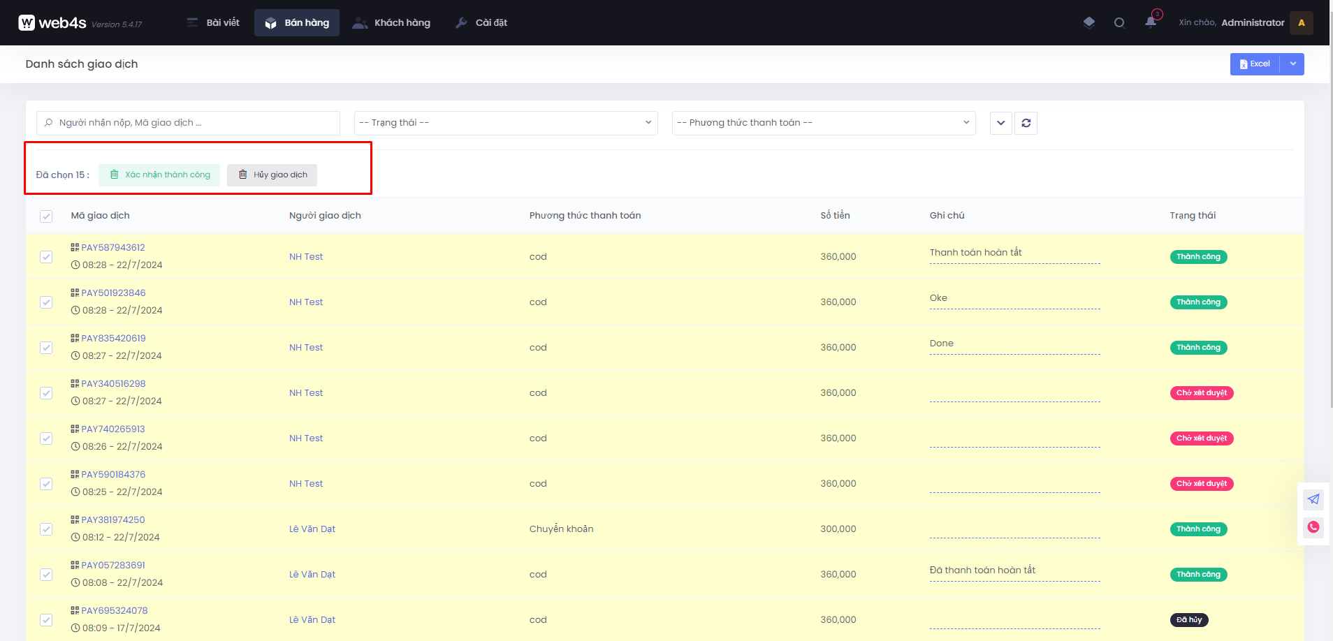 2. Xác nhận và hủy nhiều giao dịch cùng lúc
