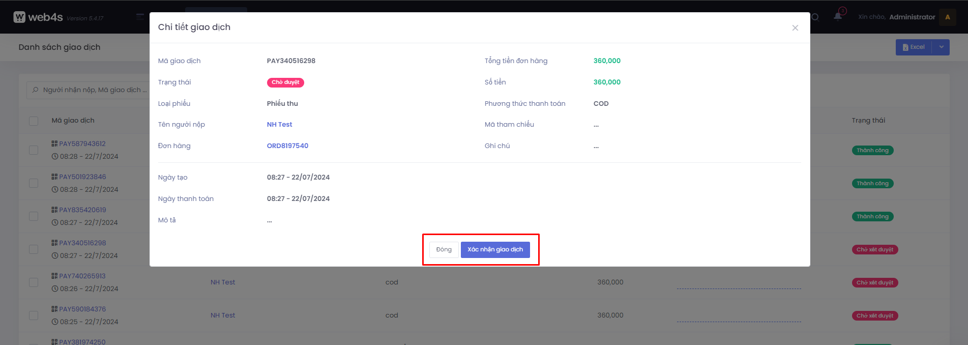 - Đối với những giao dịch có trạng thái là "Chờ xét duyệt", khi xem thông tin chi tiết giao dịch sẽ có thêm action Xác nhận giao dịch