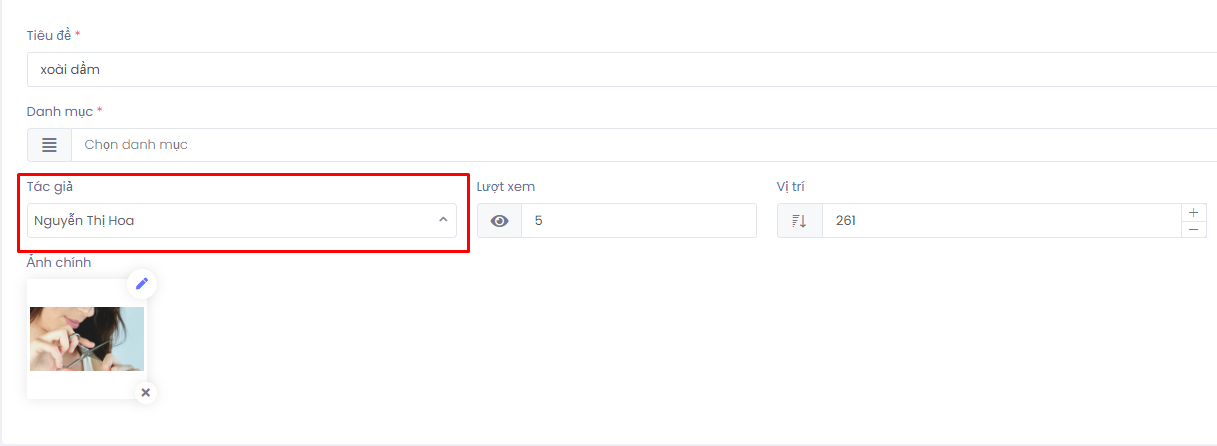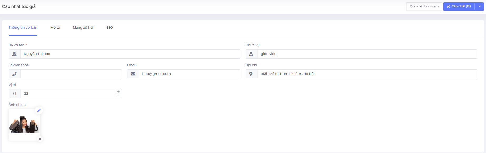 - Có thể thêm các thông tin cho tác giả như : họ tên, chức vụ, số điện thoại, email, địa chỉ, mô tả tác giả, social,.....